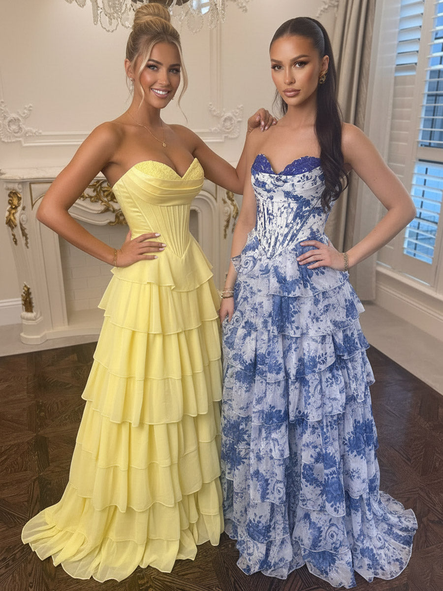 Tiered Floor-Length Fancy Prom Dresses with Flower Ruffles