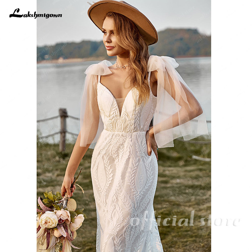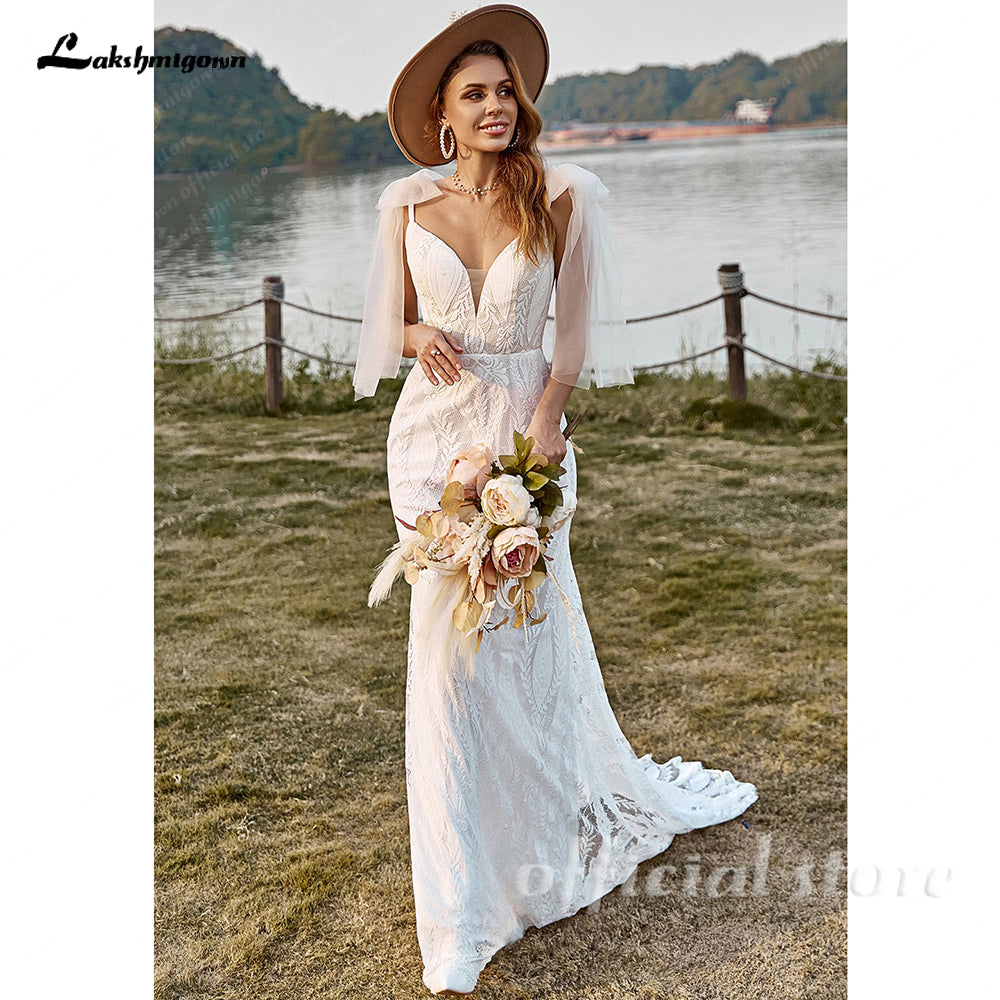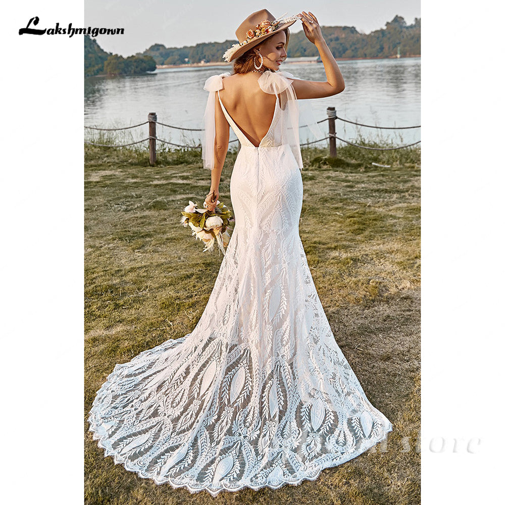 Bohemian Mermaid Wedding Dress Women V-neck Lace Spaghetti Straps Bridal Gowns