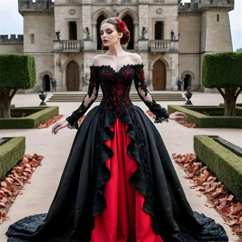 Robe de mariée gothique noire et rouge, épaules dénudées, robe de mariée médiévale à manches longues