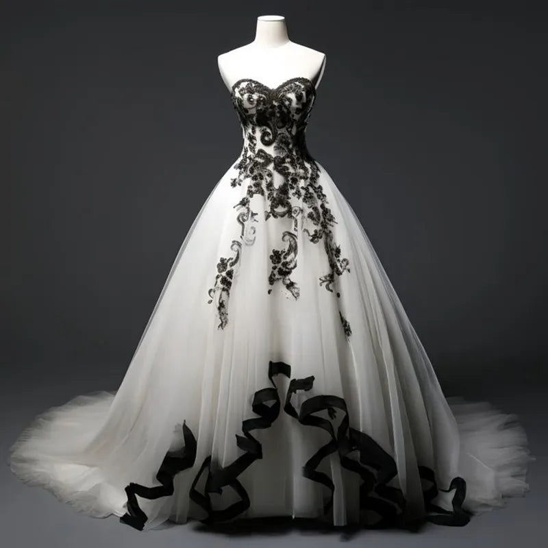 Cette robe de mariée gothique ivoire et noir, ornée d'appliqués de dentelle raffinée, allie l'élégance classique à une esthétique gothique...