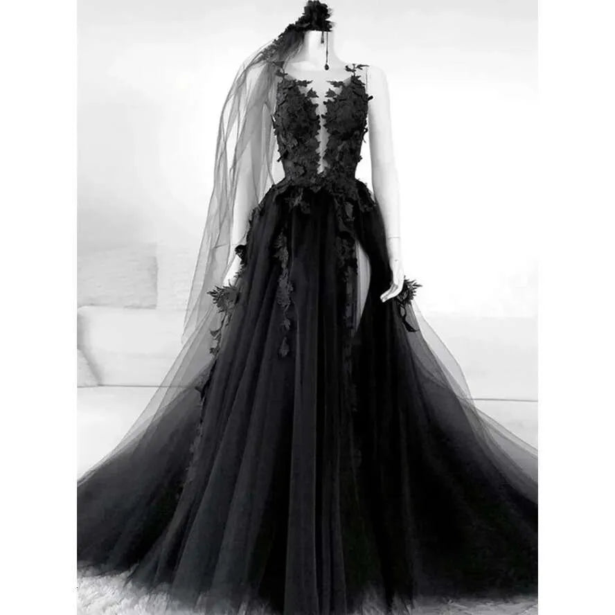 Osez un mélange saisissant d'élégance et d'audace avec cette robe de mariée gothique noire en tulle fendue jusqu'à la cuisse....