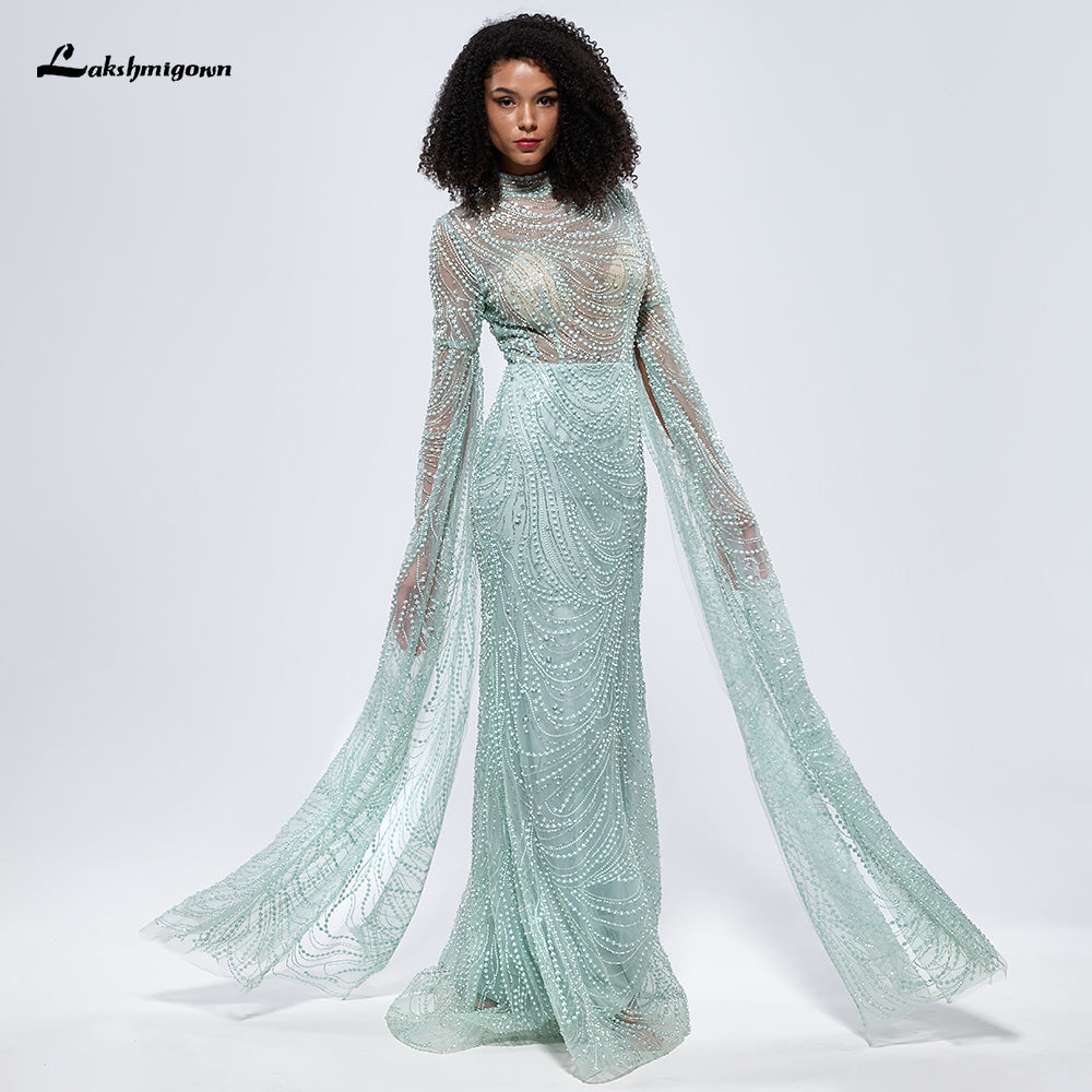 • Abito da sera a sirena Dubai verde menta con maniche a mantella e perline con perline L9668