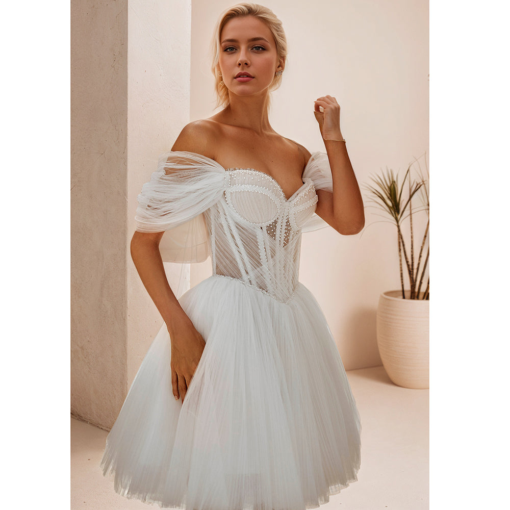 Abiti da festa da sposa corti con spalle scoperte A-Line Perline Illusion Tulle Abito da sposa al ginocchio