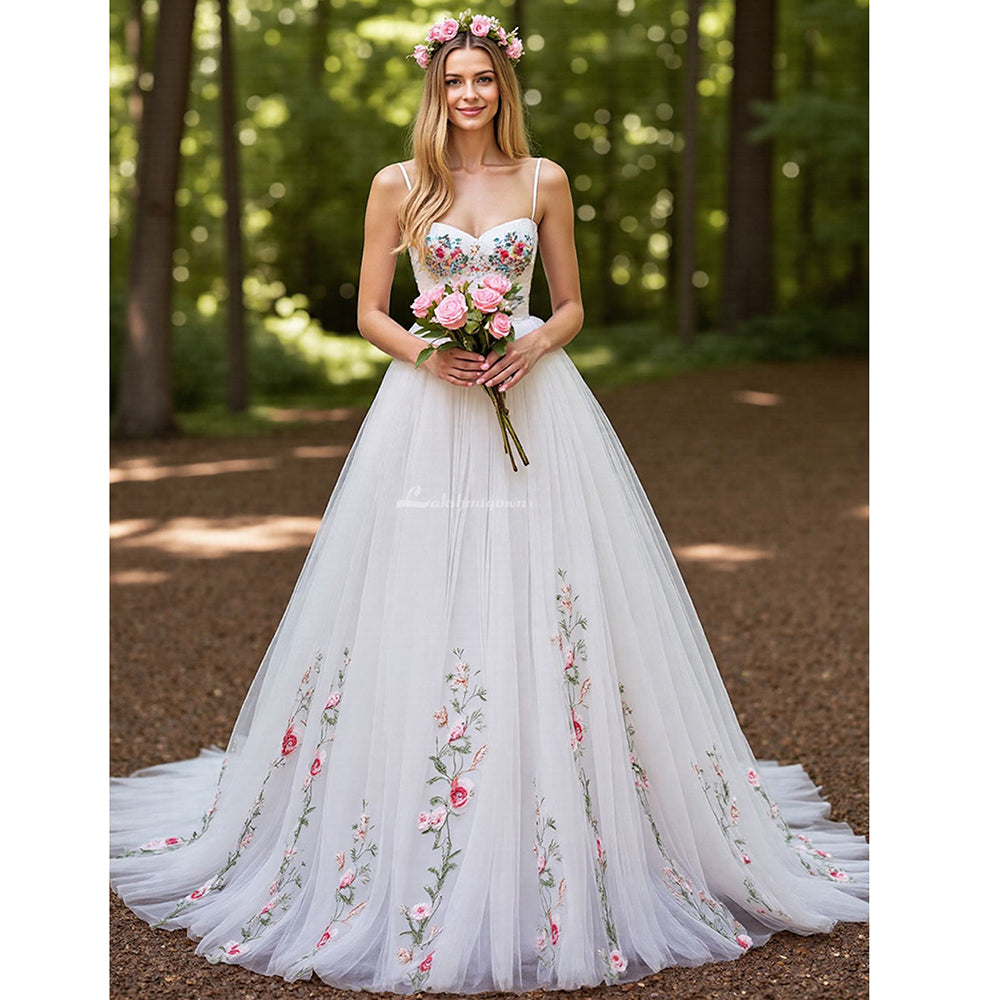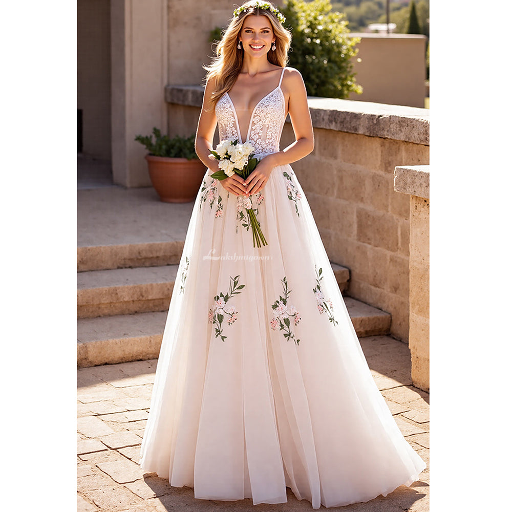Abito da sposa con stampa floreale con scollo a V, cinturino per spaghetti, applicazioni al pavimento, in pizzo, abiti da sposa country