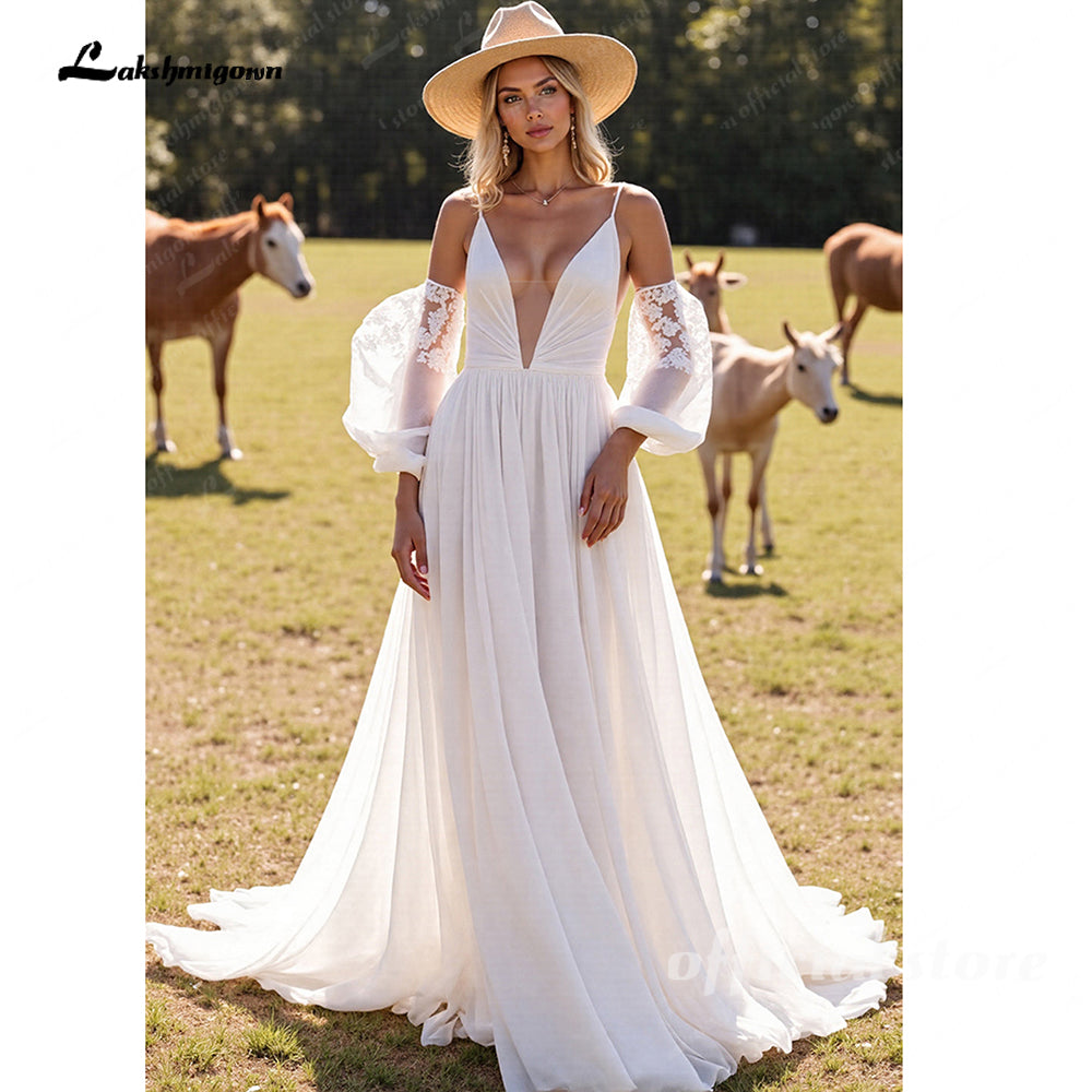 Abito da sposa bohémien in chiffon a linea A con scollo a V, maniche lunghe svasate, applicazioni in pizzo