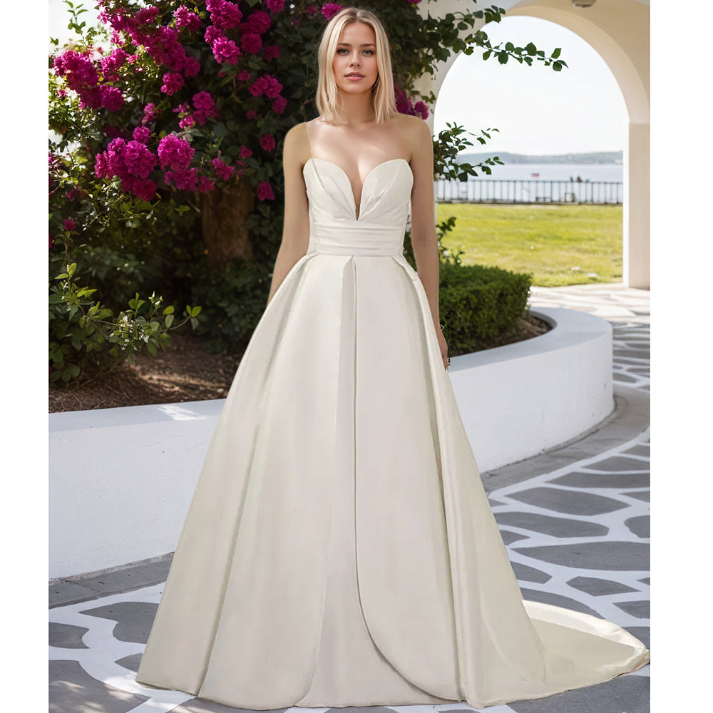 説明: 上品さ、洗練さ、自然な魅力を醸し出す、洗練されたシンプルなウェディング ドレスで、絵に描いたような完璧なブライダル モーメントを実現し、結婚式の日をさらに特別なものにしましょう。 詳細: シルエット:Aラインスタイル 生地:サテン生地 カラー: ホワイト、アイボリー 長さ: コートトレイン ネックライン:スウィートハート 袖: 袖なし 背面:ジッパーバック 装飾: プリーツ