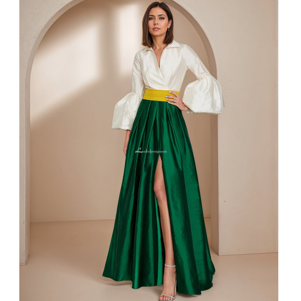 • ふくらみのある袖のグリーンのロング プロム ドレス