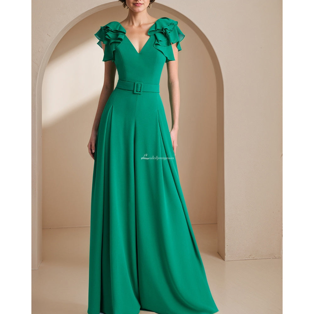 • フリル付きロンググリーンジャンプスーツイブニングドレス