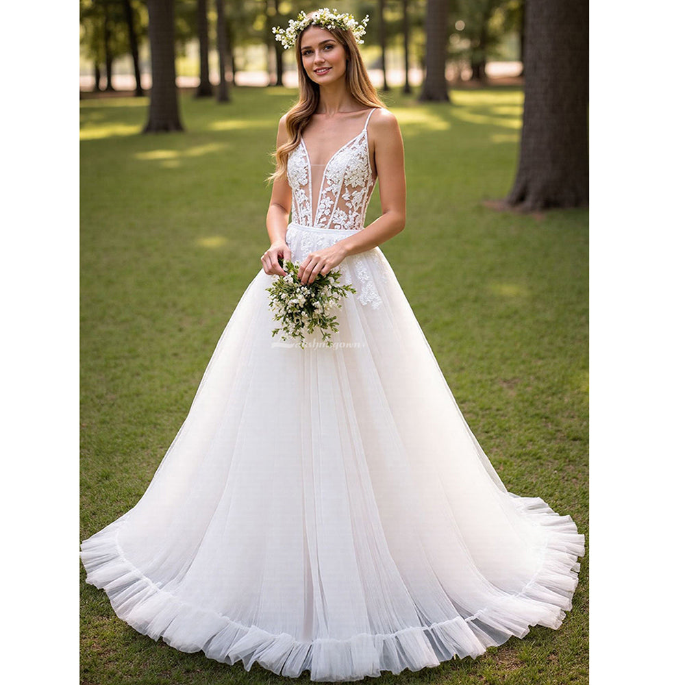スパゲッティストラップ ウェディングドレス ボヘミアン レース アップリケ Aライン Vネック チュール ブライダルドレス