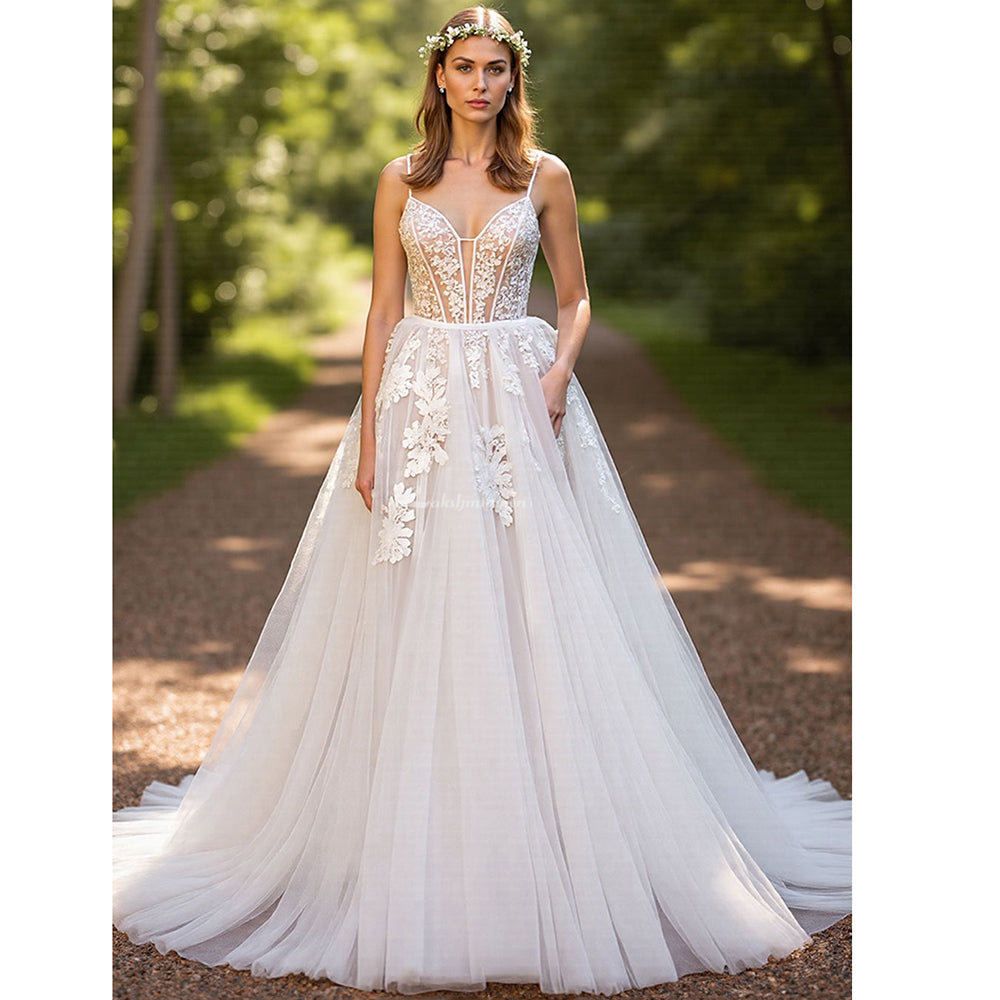 スパゲッティストラップ Aライン コルセット アップリケ Vネック ウェディングドレス