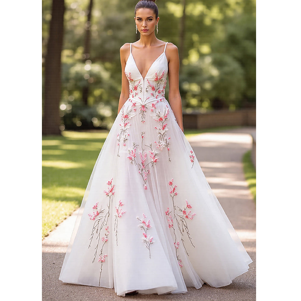 ピンクの花の刺繍 V ネックのウェディング ドレス スパゲッティ ストラップ A ラインのウェディング ドレス