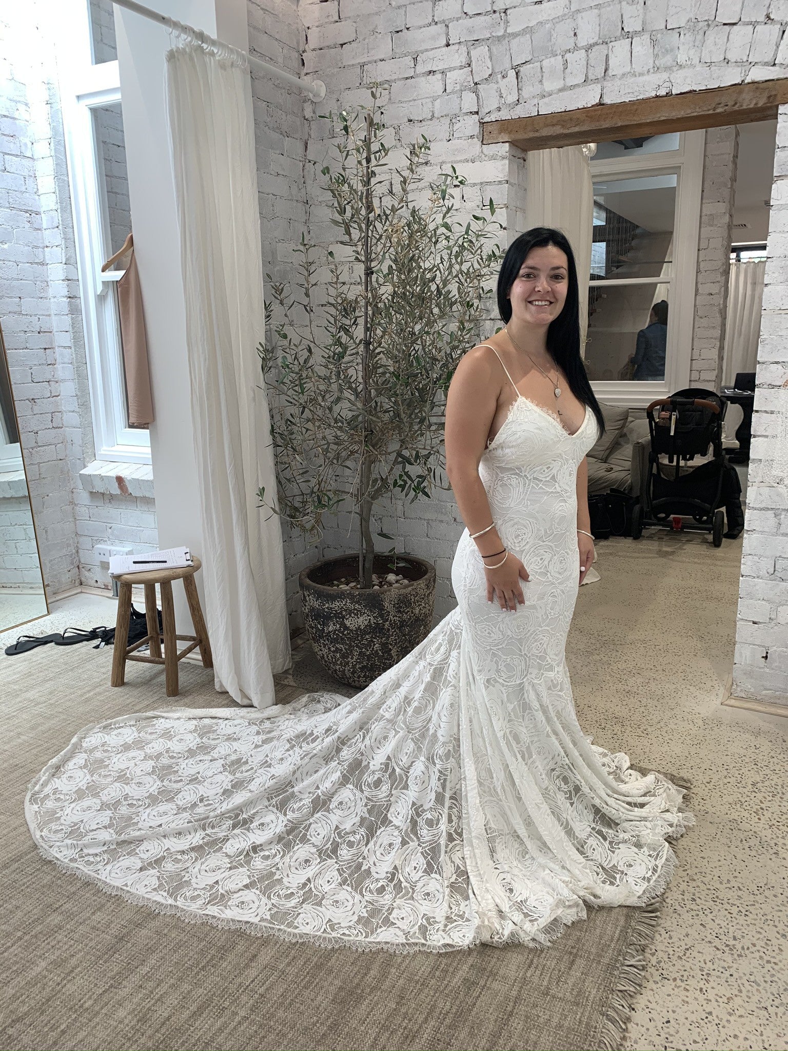 説明: 上品さ、洗練さ、自然な魅力を醸し出す、洗練されたシンプルなウェディング ドレスで、絵に描いたような完璧なブライダル モーメントを実現し、結婚式の日をさらに特別なものにしましょう。 詳細: シルエット:人魚 生地:レース生地 色: 白、アイボリー、肌色 長さ: コートトレイン ネックライン:Vネック 袖: 袖なし 背面:ジッパーバック 装飾: レース